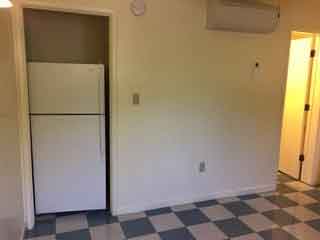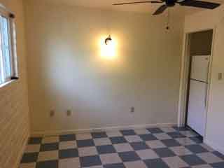 Just recently remodeled with new wiring, plumbing, ceiling fans and ductless mini-split heating and cooling. Our smallest and simplest apartment. This one room studio is very much like a dormitory room, only quieter and more private. These units have no kitchen but have a full size refrigerator, and tenants can bring in their own microwave or cooking appliance.